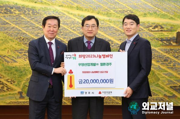 외교저널 (Diplomacy Journal) 조규호 기자 | 경주 대표 관광기업인 우양산업개발(주) 힐튼경주는 겨울 한파 속에 어려움을 겪고 있는 이웃을 위해 지난 20일 경주시청을 방문하여 희망2023 나눔캠페인 성금 2천만 원을 기탁했다.