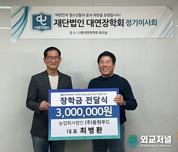 외교저널 (Diplomacy Journal) 이정하 기자 ㅣ 재단법인 대연장학회( 이사장 이정규)는 농업회사법인 (주)동원푸드 최병환 대표가 최근 장학금 300만원을 쾌척했다고 밝혔다.