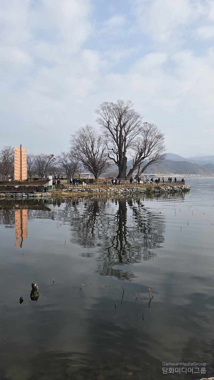 첫 번째 사진 속, 붉은 돛을 단 배는 두물머리의 겨울 풍경을 상징처럼 떠받치고 있다. 나무는 잎을 모두 비워냈지만, 가지마다 깃든 선線은 더 선명해졌다. 수면은 고요해 하늘과 나무를 완벽히 반영하고, 그 위에 정박한 돛배는 마치 긴 시간을 건너온 사신처럼 바람 한 점 없는 겨울에도 묵직한 존재감을 드러낸다. 이 돛배는 실제로 움직이지 않는다.