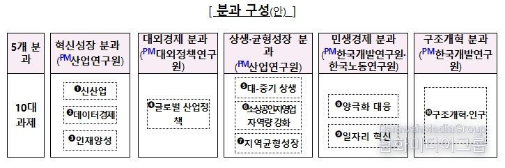 오늘 회의에서는 경인사연 소속 연구기관들이 집중 연구할 경제 대도약 10대 과제를 선별해 5개 분과로 편성하고 분과별 주관 연구기관(PM)을 지정했다. 아울러 연구 성과가 실제 정책으로 이어질 수 있도록 기재부를 중심으로 관계부처가 분과별 논의에 적극 참여해 연구기관들과 의견을 교환하도록 할 계획이다.