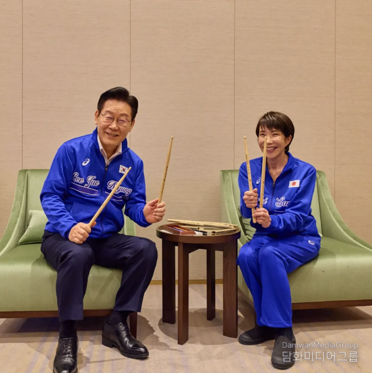양 정상은 푸른색 유니폼을 착용하고 일본 대표 악기 브랜드 ‘펄’ 드럼 앞에서 즉석 합주를 선보였다. 케이팝 데몬 헌터스의 ‘골든’과 BTS의 ‘다이너마이트’를 연주하며 현장을 문화 교류의 장으로 만들었다. 다카이치 총리는 드럼 스틱을 선물했고, 양 정상은 각각 서명한 스틱을 교환했다.