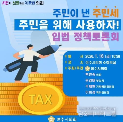 외교저널 (Diplomacy Journal) 김학영 기자 | 여수시의회는 오는 1월 16일 오전 10시 30분, 여수시의회 소회의실에서 '주민이 낸 주민세, 주민을 위해 사용하자' 입법 정책토론회를 개최한다.
