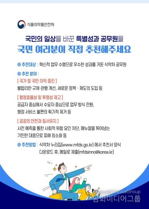 외교저널 (Diplomacy Journal) 이준석 기자 | 식품의약품안전처는 국민이 체감하는 탁월한 성과를 창출한 공무원을 국민이 직접 추천해 포상하는 ‘국민추천제’를 1월 20일부터 운영한다고 밝혔다.