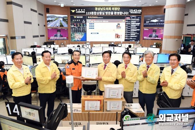 외교저널 (Diplomacy Journal) 김학영 기자 | 경남도의회 김진부 의장, 최학범 제1부의장, 강용범 제2부의장, 신종철 운영위원장, 박해영 건설소방위원장은 21일 추석 명절을 맞아 119종합상황실을 방문하여 근무자들의 노고를 격려하고 위문품을 전달했다.