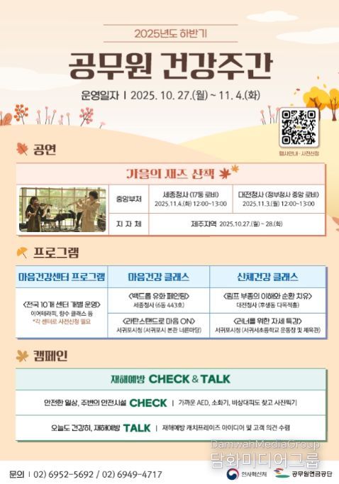 인사혁신처와 공무원연금공단은 공무원의 재해 예방과 건강한 공직문화 조성을 위해 세종, 대전, 제주지역 등에서 ‘2025 하반기 공무원 건강 주간 행사’를 27일부터 11월 4일까지 동시 진행한다고 24일 밝혔다.