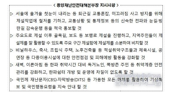 아울러, 국민께서도 기상정보를 수시로 확인하고, 주간 시간대 안전한 상황에서 제설작업을 실시하는 등 국민행동요령을 준수해 주실 것을 당부했다.