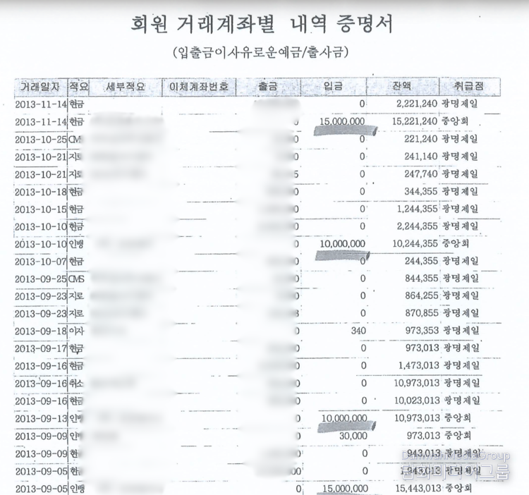 본지가 입수한 ‘개인계좌 거래내역 증명서(총 16쪽, 2009년 04월 ~ 2015년 06월)'