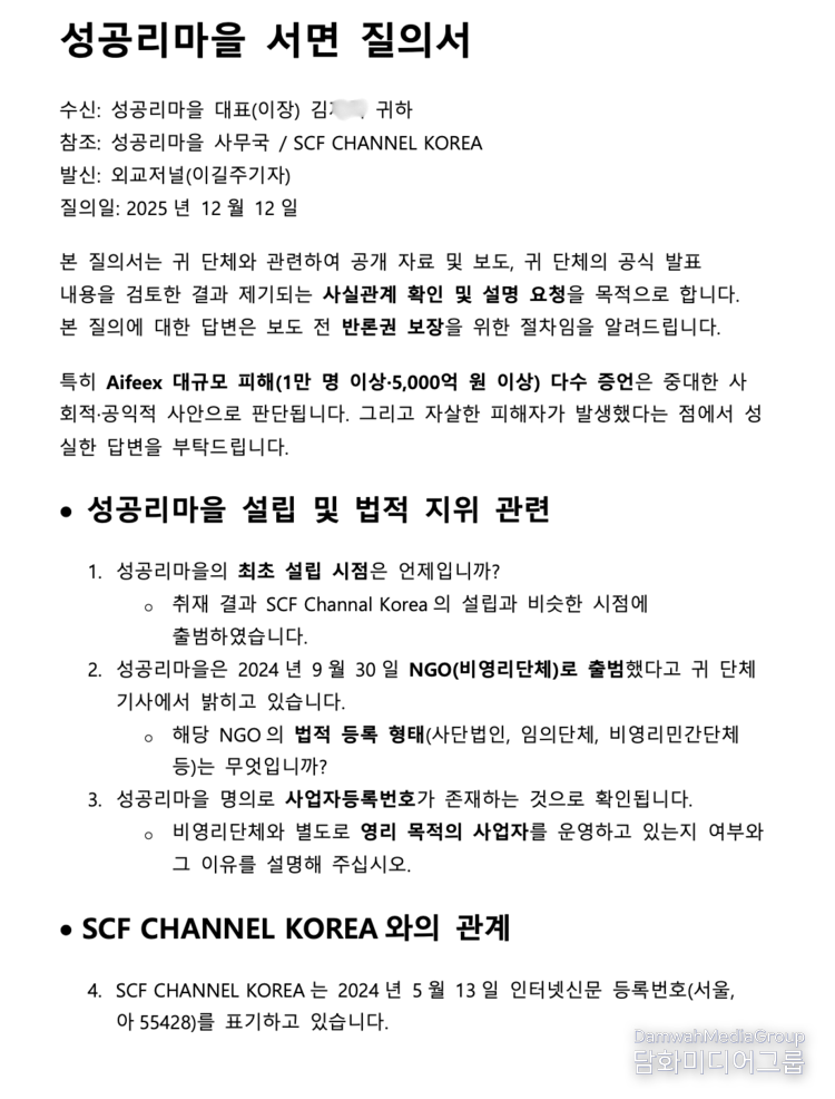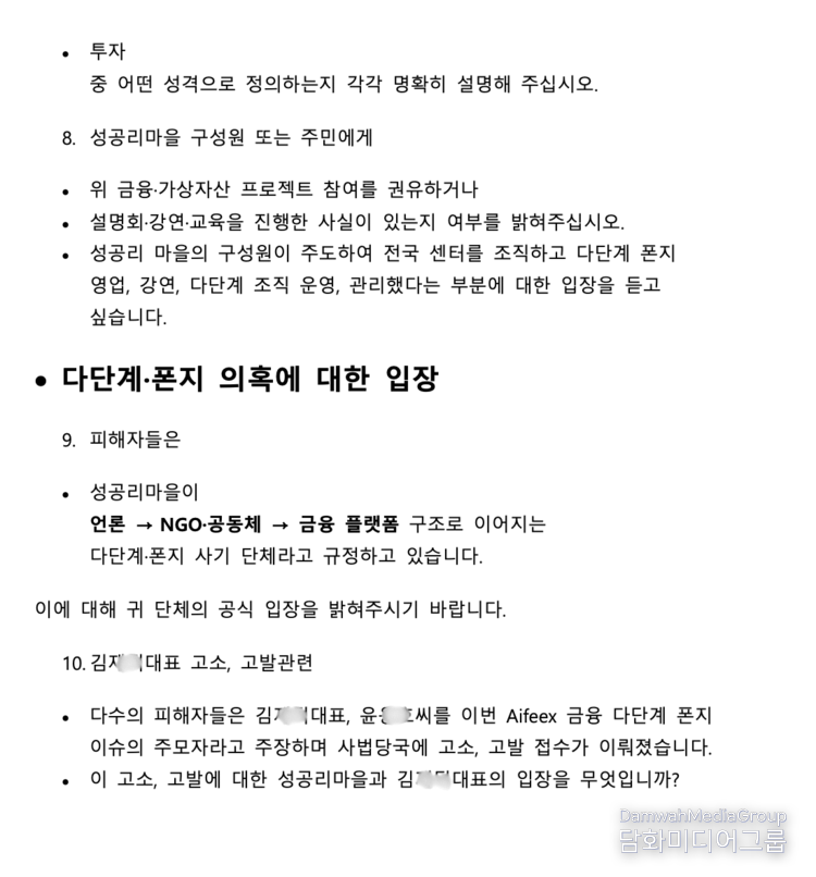 성공리마을과 Aifeex 금융 다단계·폰지 사기 의혹을 둘러싼 핵심 질문에 대해, 성공리마을 측은 끝내 아무런 답변을 내놓지 않았으며 본지가 보낸 공식 서면 질의서에는 조직 운영 구조(내부 조직도 입수), Aifeex와의 관계, 대규모 피해 증언(1만 명 이상·5,000억 원 이상), 극단적 선택을 한 피해자 그리고 김**·윤** 씨의 역할에 대한 구체적인 질문이 담겨 있었지만, 기한 내 회신은 없었다.