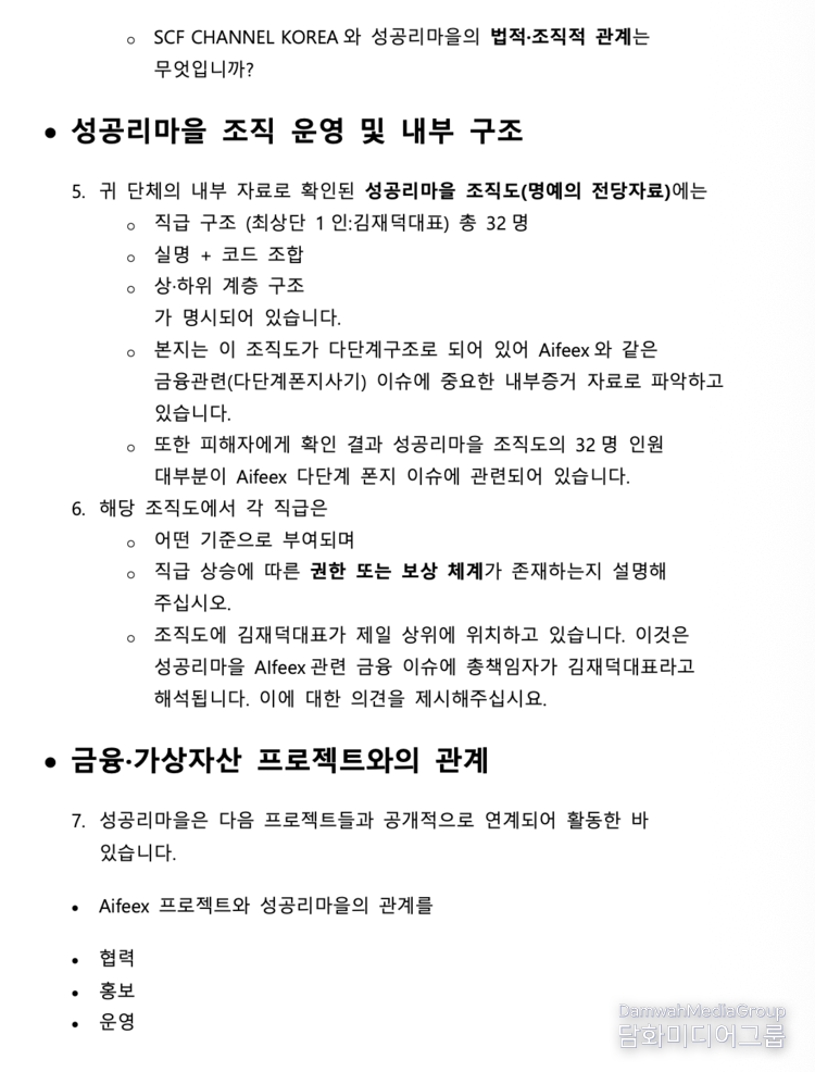 “확보된 성공리마을 조직도는 일반적인 마을 공동체 문서와 달리, 단일 정점을 중심으로 GM·VP 등 영업조직 직급이 배치되고, 실명과 코드가 병기된 전형적인 다단계 관리 문서의 형식을 띠고 있다. 특히 조직도 최상단에는 Aifeex 금융 다단계·폰지 사기 의혹의 핵심 인물로 지목돼 온 김**과 윤**의 이름이 확인된다.”
