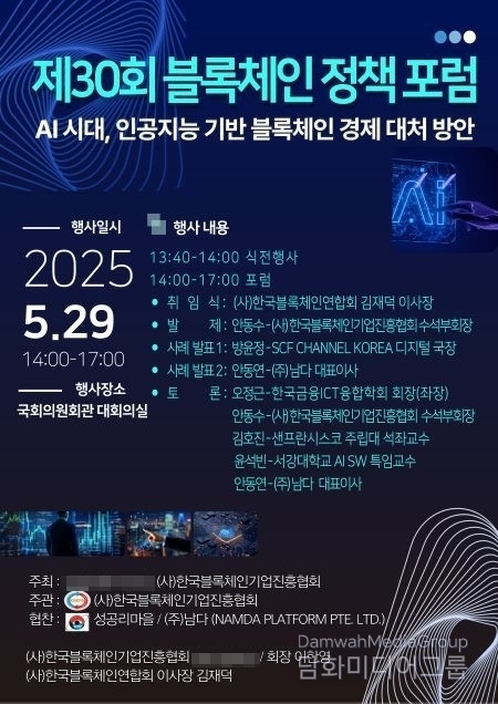 외교저널 (Diplomacy Journal) 이길주 외교부 출입 기자 | 지난 5월 29일 ‘제30회 블록체인 정책 포럼’이라는 이름으로 열린 이 행사는 정책 토론을 표방한 국회 공식 행사였다. 그러나 본지가 확보한 공식 포스터, 행사 영상 캡처, 발표 슬라이드를 종합 분석한 결과, 이 행사는 성공리마을 핵심 인물들과 AIFEEX 투자상품을 전면에 내세운 홍보 구조로 운영됐다는 사실이 드러났다.