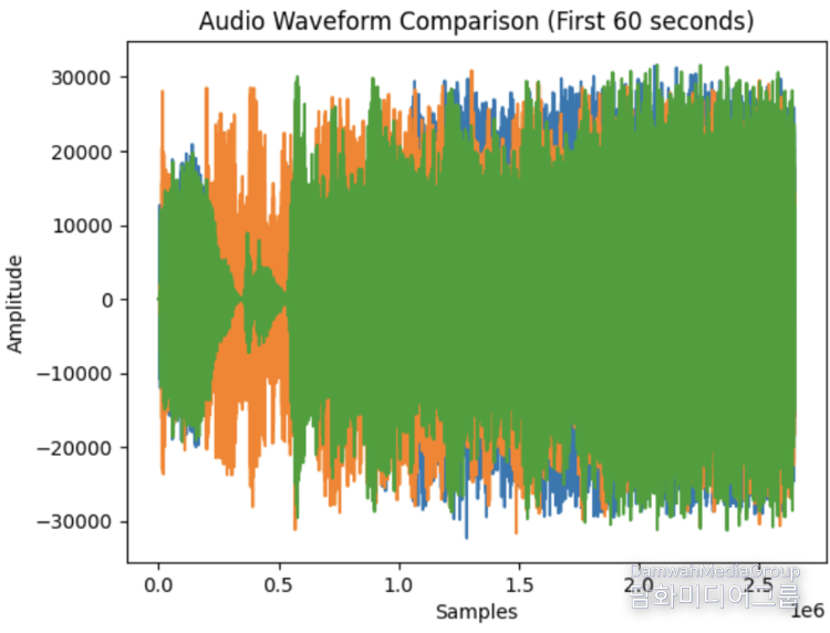 본지가 수행한 음원 파형 분석 결과, 음원 파일 자체는 동일하지 않지만 에너지 분포와 구조가 사실상 동일한 패턴을 보였다.