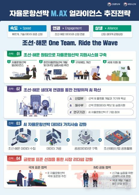 김정관 산업부 장관은 “우리 조선・해운산업은 그간 험난한 파도를 슬기롭게 이겨낸 경험이 있는 만큼, 눈 앞에 다가오는 AI 파도도 업계가 힘을 모아 추진 동력으로 활용해 더 큰 미래로 나아가야 한다”고 말했다. 또한, “자율운항선박은 M.AX 전략의 대표적인 성과를 창출할 수 있는 분야로, 세계 최고 조선 기술에 AI를 결합한다면, 대한민국이 차세대 조선・해운 시장을 선도할 수 있다”라며, “산업부는 해수부와 함께 M.AX 얼라이언스를 중심으로 기술개발과 데이터 활용, 산업 생태계를 유기적으로 연결해 자율운항선박을 조선・해운의 미래 먹거리로 육성해 나가겠다”고 밝혔다.