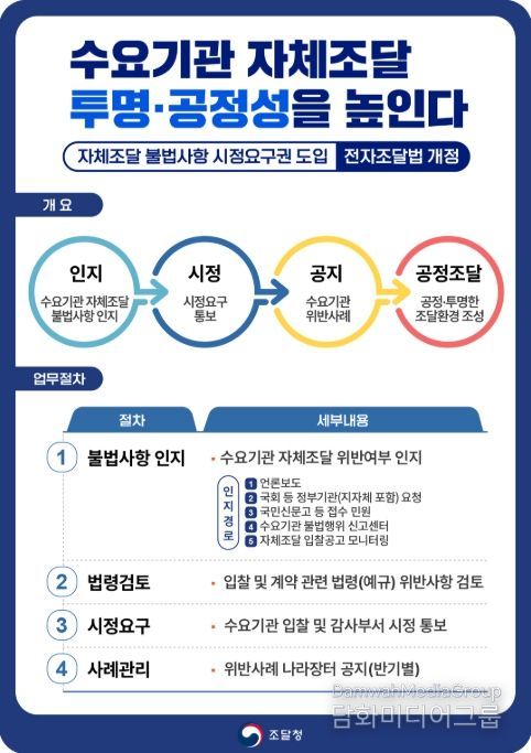조달청은 '전자조달의 이용 및 촉진에 관한 법률'개정을 통해 수요기관 자체조달 과정에서 불법 및 법령위반 시 해당 수요기관에 입찰 공고 수정, 계약 조건 변경 등을 공식적으로 요구할 수 있는 시정요구권을 도입한다고 밝혔다.