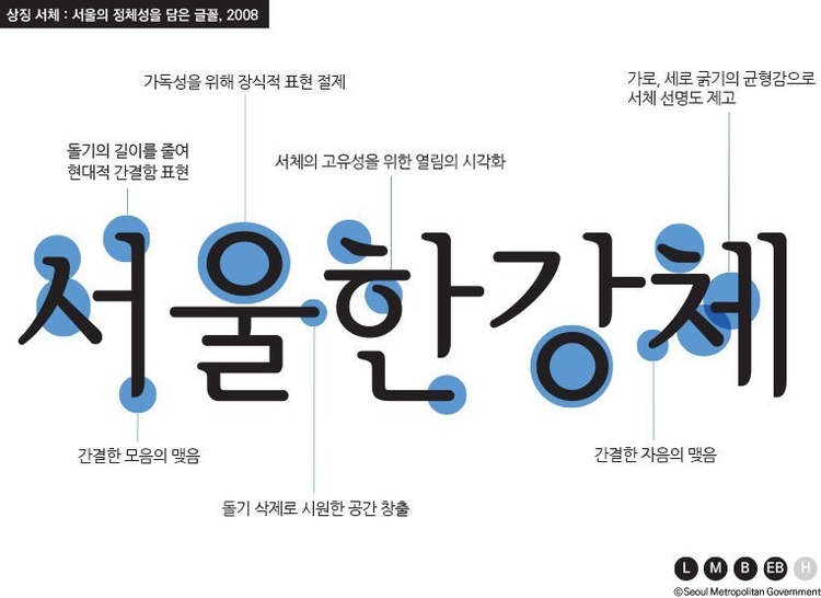 2008년 7월 오세훈 시장의 디자인 도시 선언과 함께 탄생한 서울서체는 강직한 선비정신과 단아한 여백의 미를 담고 있다. 조형적으로는 한옥의 열림과 기와의 곡선미를 표현했으며, '한강'과 '남산'이라는 서울의 대표 자산에서 이름을 따왔다.