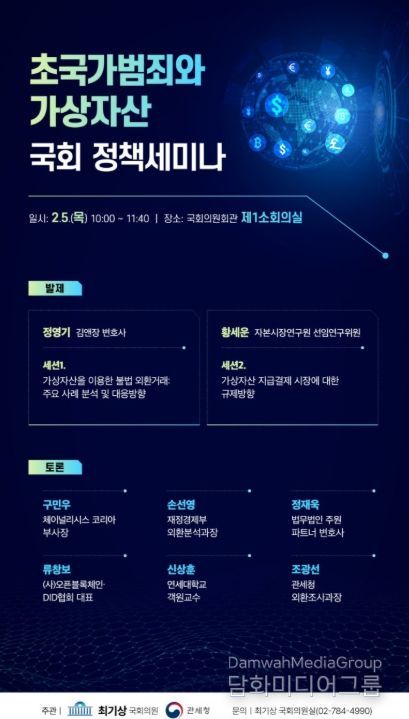외교저널 (Diplomacy Journal) 강갑수 기자 | 관세청은 최기상 국회의원(더불어민주당·서울 금천구)과 공동으로 2월 5일 국회 의원회관에서 '초국가범죄와 가상자산: 국경을 넘어선 불법 자금 흐름 대응' 국회 정책 세미나를 개최했다.