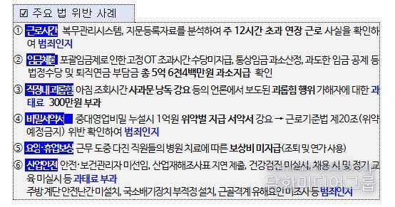 이와 함께 연장·야간·휴일근로 수당 등 임금 미지급 5억 6천4백만원에 대해서도 시정지시했다.