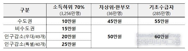 소득 하위 70% 국민에게 거주 지역별로 수도권 10만원, 비수도권 15만원, 인구감소 우대지역 20만원, 인구감소 특별지역 25만원을 지급할 예정이며, 한부모가족・차상위계층은 45만원, 기초생활수급자는 55만원을 지급하되 비수도권에 거주하는 경우에는 1인당 5만원을 추가 지급한다.
