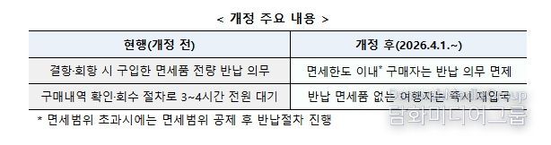 관세청은 지난 2월 말 면세품 회수 예외 근거가 「관세법 시행령」에 마련됨에 따라, 세부 이행 절차를 담은 「여행자 및 승무원 휴대품 통관에 관한 고시」 개정을 완료하고 4월 1일부터 본격 시행한다고 밝혔다.