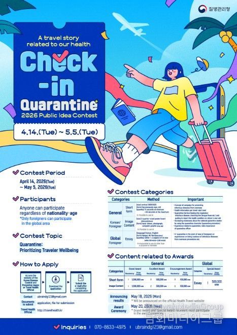 외교저널 (Diplomacy Journal) 이준석 기자 | 질병관리청은 건강한 해외여행 문화를 확산하고 여행자 건강 중심 검역에 대한 국민 인식을 높이기 위해 4월 14일부터 5월 5일까지 '체크인, 검역 : 우리가 만드는 여행건강 이야기, 국민 생각 공모전'을 개최한다.