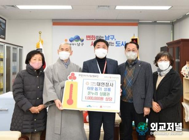 외교저널 (Diplomacy Journal) 조규호 기자 | 부산시 남구에 위치한 대한불교조계종 대연정사(주지 능후)에서는 부산광역시 남구에 지난 20일 관내 저소득 계층을 위한 100만원 상당의 온누리상품권을 전달했다.