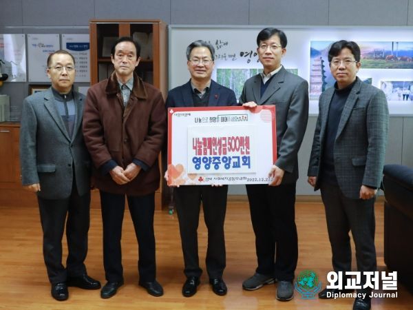 외교저널 (Diplomacy Journal) 조규호 기자 | 영양중앙교회는 12월 27일 영양군청을 방문하여 지역의 어려운 이웃과 희망을 나누고자 불우이웃돕기 성금 500만원을 기탁하며‘희망2023 나눔 캠페인’에 동참했다.