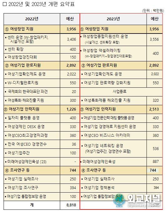 외교저널 (Diplomacy Journal) 이정하 기자 | 중소벤처기업부는 5일 ① 여성 창업지원, ② 여성기업 국내·외 판로지원, ③ 여성기업 경영지원 등 총 12개 사업으로 구성된 「2023년 여성기업육성사업 통합 공고」를 한다.