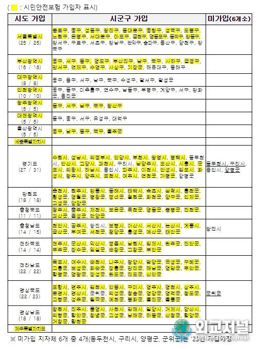 올해 1월 이후 시민안전보험을 신규 계약하는 지자체는 사회재난 사망 특약을 포함하여 가입할 수 있으며, 계약기간이 만료되지 않은 지자체는 만료일 기간까지 사회재난 사망 특약 추가 가입이 가능하다.