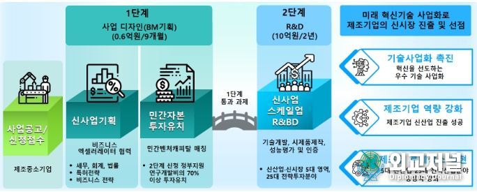 스케일업 기술사업화 프로그램은 1단계로 기업과 엑셀러레이터가 함께 비즈니스 모델(BM)의 완성도를 높이도록 지원하고 IR을 통해 벤처캐피털 투자가 결정되면, 2단계 평가를 거쳐 2년간 과제당 10억원의 R&D 자금을 지원하는 민간투자 연계형 R&D 사업이다.