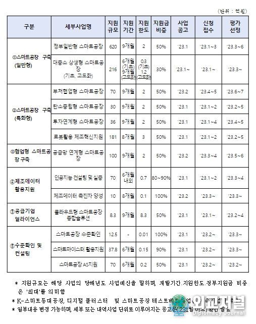 향후 세부사업별 공고를 통해 지원대상, 지원내용, 지원조건 등을 상세히 안내할 예정이며(참고1), 중소벤처기업부 누리집 kr) 또는 스마트공장 사업관리스시템에서 확인할 수 있다.