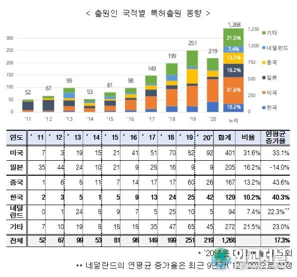 일본의 출원량은 다소 감소하는 경향을 보인 반면, 중국(연평균 43.6%)과 한국(연평균 40.3%)의 출원 증가폭은 상대적으로 높았다.