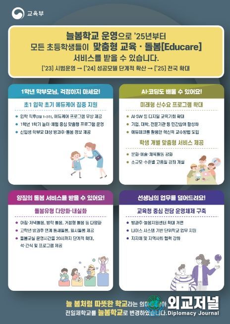 외교저널 (Diplomacy Journal) 이정하 기자 | 교육부는 초등학생 방과 후 활동 지원을 통해 교육과 돌봄에 대한 국가책임을 강화하고자 1월 9일, 정부세종청사에서 '늘봄학교' 추진방안을 발표한다.