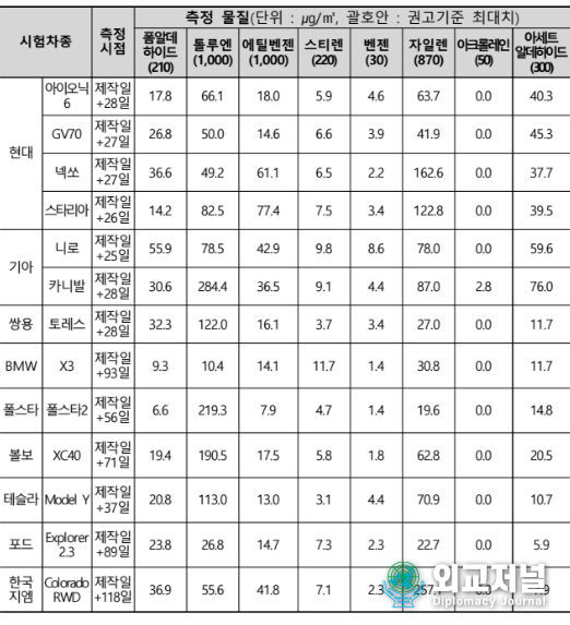 외교저널 (Diplomacy Journal) 이정하 기자 | 국토교통부는 ’22년 실내 공기질 조사대상인 16개 자동차 제작사의 25개 차종에 대해 신차 실내공기질 조사를 실시하였으며, 조사 결과 대상 차종 전부 권고기준을 충족한 것으로 확인되었다.