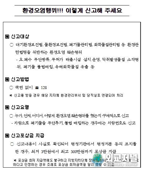 특히 ‘환경오염행위 신고창구’를 집중 운영하며, 국민 누구나 환경오염행위를 발견하면 국번없이 128로 전화(휴대전화의 경우는 지역번호와 함께 128번)하여 신고하면 된다.