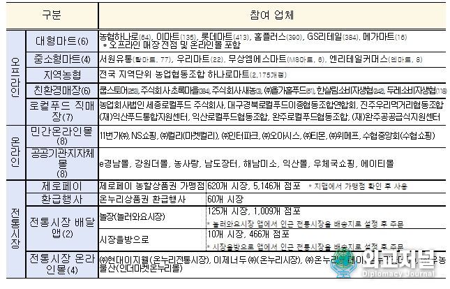 소비자는 대형·중소형마트, 지역농협(하나로마트), 친환경매장, 지역농산물(로컬푸드) 직매장, 전통시장, 온라인몰 등 다양한 유통경로에서 국산 신선 농축산물 구매 시 20%(전통시장 30%)를 할인받을 수 있다. 할인행사별 1인당 할인 한도는 1만 원에서 2만 원(전통시장은 2만 원에서 3만 원)으로 상향했으며, 대형마트 등에서 실시하는 자체 할인행사(10~20% 수준)를 포함하면 소비자의 부담이 30~40% 줄어들 것으로 기대된다.