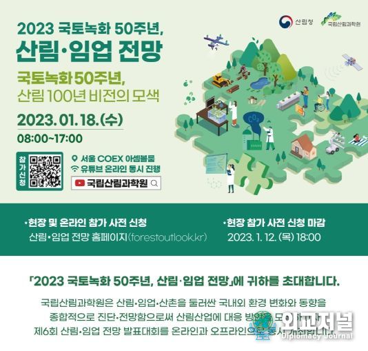 외교저널 (Diplomacy Journal) 이정하 기자 | 산림청 국립산림과학원(원장 박현)은 오는 1월 18일, 온·오프라인(코엑스 아셈볼룸)으로 동시 개최 개최되는 '2023 국토녹화 50주년, 산림·임업 전망'발표대회의 참가자 사전 신청을 12일 오후 6시에 마감한다고 밝혔다.