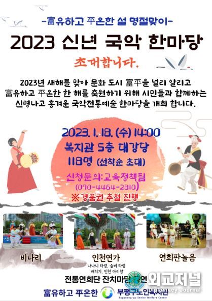 외교저널 (Diplomacy Journal) 이성준 기자 | 부평구노인복지관은 계묘년(癸卯年) 새해를 맞이하여 시민 118명을 초청하여 문화 도시인 부평을 널리 알리고자 ‘2023 신년 국악 한마당’을 오는 18일 복지관 대강당에서 개최한다고 밝혔다.