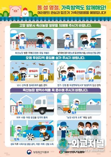 외교저널 (Diplomacy Journal) 이정하 기자 | 고병원성 조류인플루엔자 및 아프리카돼지열병 중앙사고수습본부는 예년보다 이른 설 명절에 대비하여 민생안정과 물가를 최우선으로 하여 가축방역에 빈틈이 생기지 않도록 설 연휴 가축전염병 방역대책을 추진해 나간다고 밝혔다.