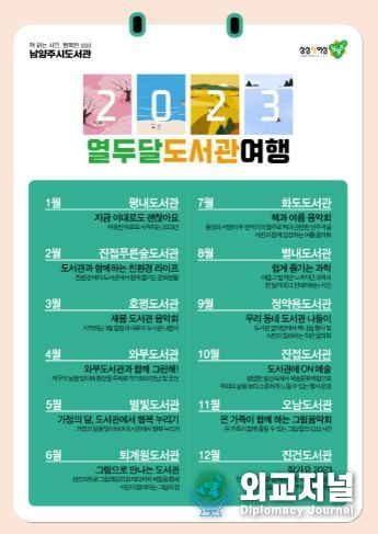 외교저널 (Diplomacy Journal) 이성준 기자 | 남양주시는 올해 1월부터 12월까지 매월 관내 12개 공공 도서관에서 각 도서관의 특색을 보여 주는 ‘2023 열두 달 도서관 여행’을 운영한다고 26일 밝혔다.