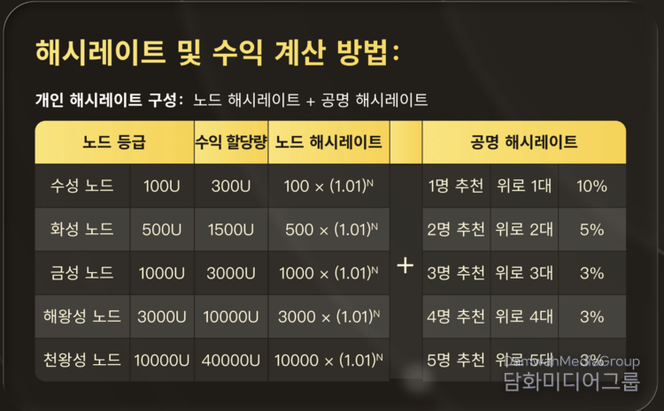 300~400% 전략적 수익 할당: 노드 구독자들은 초기 예치금액 대비 3배에서 4배에 달하는 '전략적 수익 쿼터'를 할당받는다고 명시되어 있다. 예컨대, 1,000U를 예치하면 3,000 USD1, 10,000U를 예치하면 40,000 USD1을 약속받는 구조이다.