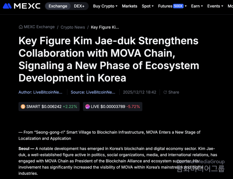 | MEXC (뉴스 섹션) | 2025.12.13 | 거래소 공식 정보 채널 | MOVA Chain 생태계 동향 및 김재덕 협력 언급 |