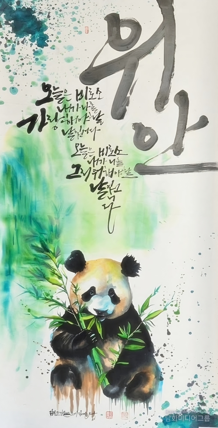 작품 속 판다는 단순한 동물이 아니다. 먹을 머금은 붓으로 그려진 눈동자에는 인간의 감정이 깃들고, 유채로 쌓아 올린 몸체에는 생명의 온기가 남아 있다. 대나무의 초록은 자연의 생동을, 배경의 번짐은 여백의 사유를 불러온다.