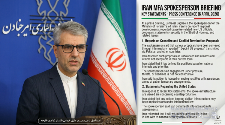 에스마일 바게이(Esmaeel Baghaei) 이란 외무부 대변인은 6일 브리핑에서 파키스탄 등 중개 채널을 통해 전달된 이른바 ‘미국의 15개항 제안’을 공식 거부했다. 이란 측은 이 제안이 자국의 국익과 우선순위에 부합하지 않는 불평등한 상태이며, 현재의 형태로는 수용할 수 없다는 점을 분명히 했다.