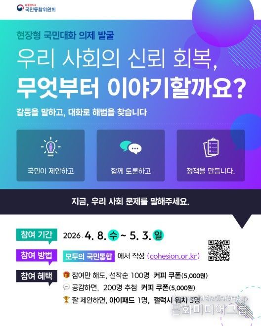 외교저널 (Diplomacy Journal) 이준석 기자 | 대통령직속 국민통합위원회는 올해부터 새롭게 추진하는 '현장형 국민대화'의 온라인 소통 창구인 ‘모두의 국민통합’ 을 4월 8일 10시에 개통하고, 국민통합을 향한 대화에 나선다.