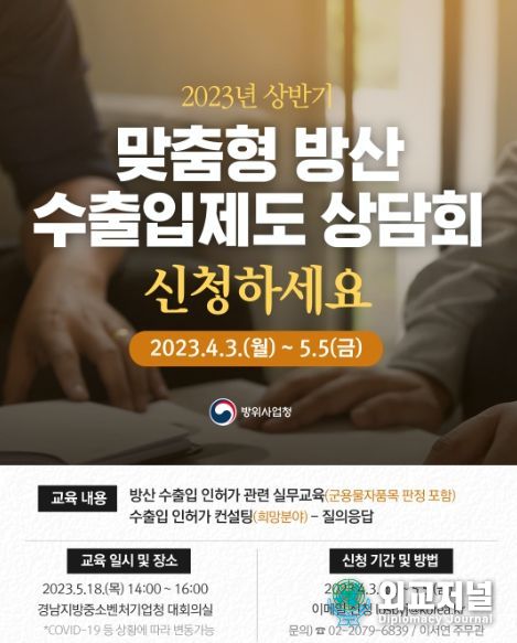 2023년 상반기 맞춤형 방산 수출입제도 상담회 접수기간은 4월 3일(월)부터 5월 5일(금)까지이며, 방산물자(국방과학기술) 수출입 또는 중개하는 기업과 그 밖에 수출입 유관기관은 어디나 참여를 신청할 수 있다. 자세한 사항은 방위사업청 누리집에서 확인이 가능하다. 접수기간 외에 상담회 참여를 추가로 희망하는 기업은 이메일 또는 전화로 사전 상담 후 신청하면 된다.