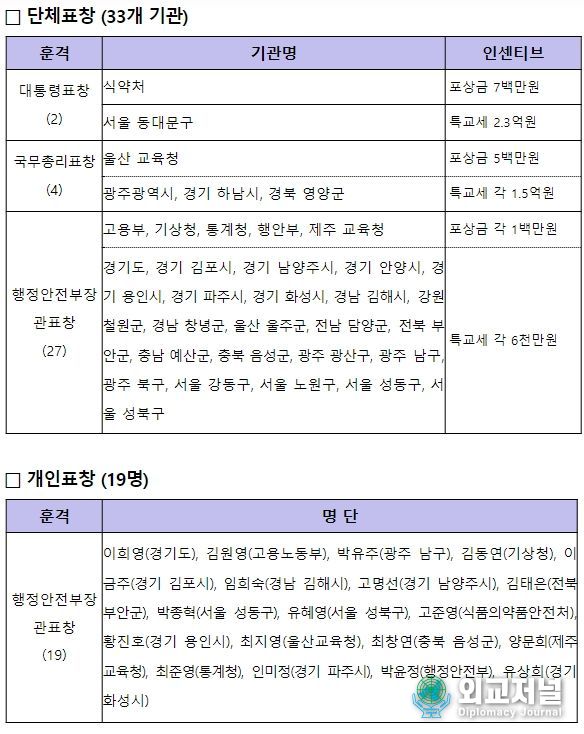 외교저널 (Diplomacy Journal) 이존영 기자 | 식품의약품안전처와 서울 동대문구가 지난해 민원서비스 종합평가에서 대통령표창을 수상했다.