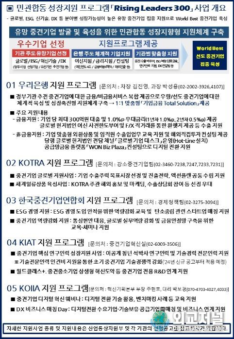 외교저널 (Diplomacy Journal) 이존영 기자 | 산업통상자원부와 우리은행(은행장 이원덕)은 5월 12일 중견기업 전용 금융지원 프로그램 '라이징 리더스(Rising Leaders) 300' 지원대상 기업을 모집한다.