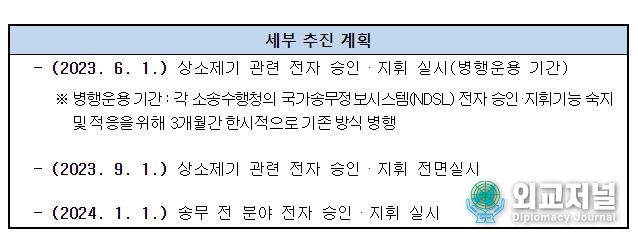 법무부는 전자승인·지휘체계의 원활한 이행과 정착을 위하여 2023. 4. 6일부터 5. 12일까지 총 6회의 전국 광역자치단체 권역별 순회 설명회 등을 실시했고, 5월 중 중앙행정기관 대상 추가 설명회 및 교육영상 배포 등을 실시할 예정이다.