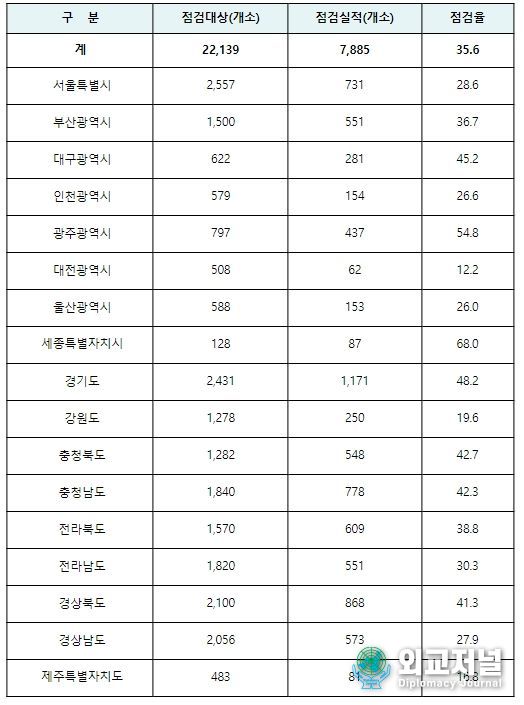 5월 12일까지 민간전문가 등 연인원 20,282명이 점검에 참여하여 점검대상의 약 39.2%인 11,644개소에 대해 점검을 완료했다.
