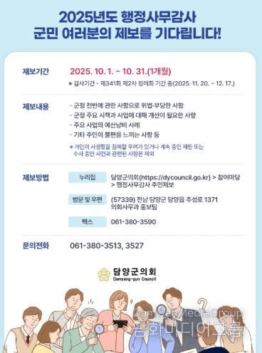 제보는 담양군의회 누리집, 이메일, 우편, 팩스 등 다양한 방법으로 제출할 수 있으며, 접수된 제보 내용은 실무 검토를 거쳐 오는 11월에 실시되는 제341회 제2차 정례회 기간 중 실시되는 행정사무감사에 적극 반영할 예정이다.