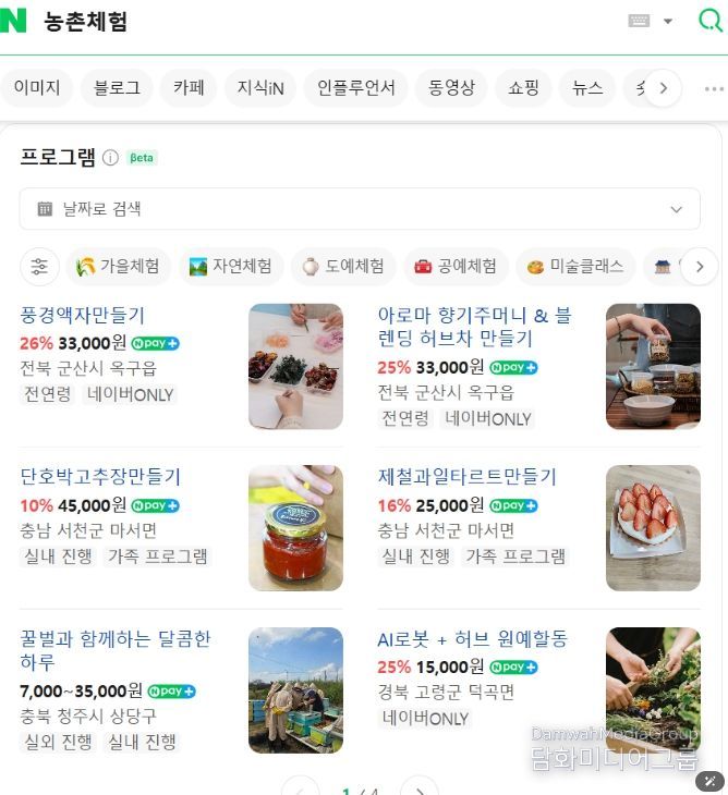 네이버 검색창에 ‘농촌체험’을 입력하면 화면 중간에 통합 정보창 ‘프로그램’이 보인다. 여기서 공기정화식물 화분 만들기, 제철 농작물 수확, 동물교감, 곤충 표본 체험 등 전국 42개 농장에서 운영 중인 우수 프로그램 정보를 확인, 예약할 수 있다.